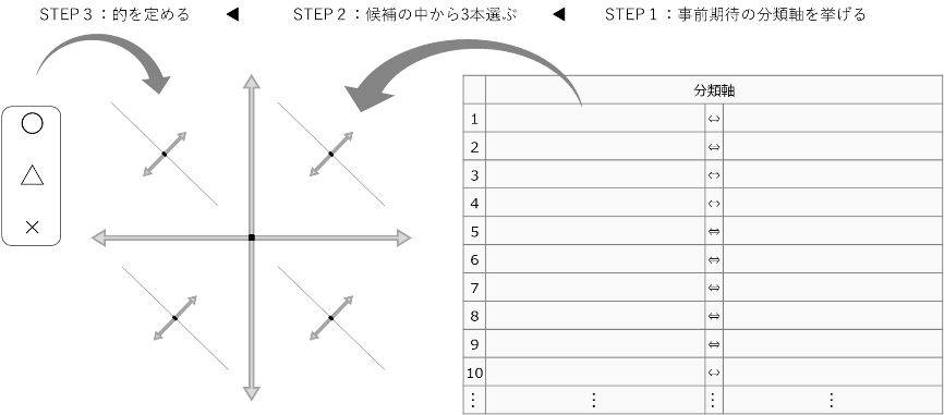 次に、洗い出した事前期待の分類軸の候補の中から、「3本」の軸を厳選します。たくさんの候補から、あえて3本に絞ることで、何に注力すべきかについて徹底的に議論するきっかけとなります。1本や2本だけでも、事前期待の的をモデル化することは可能ですが、より実践的かつ効果的な「価値の設計図」にするためには、3本がおすすめです。